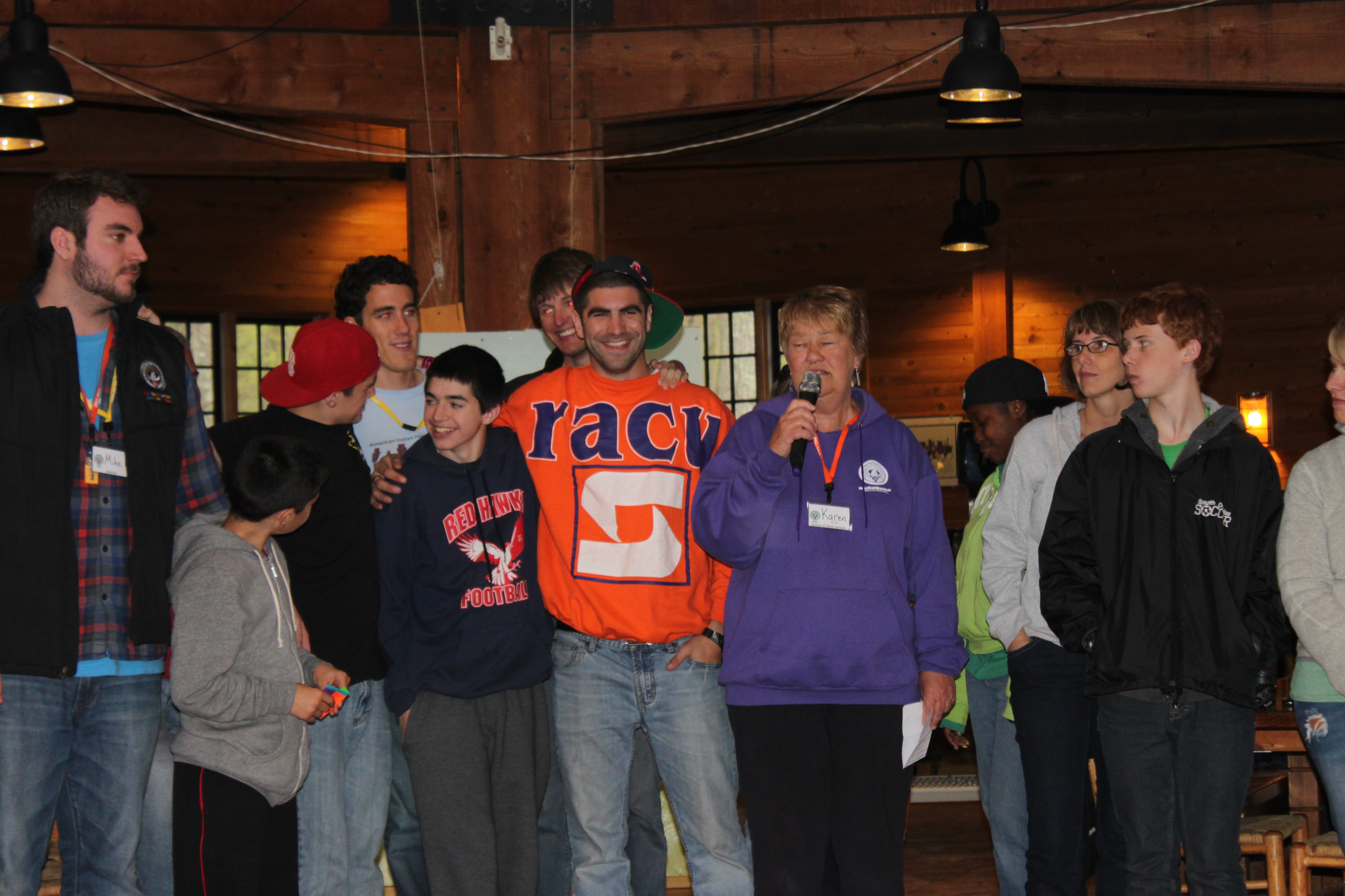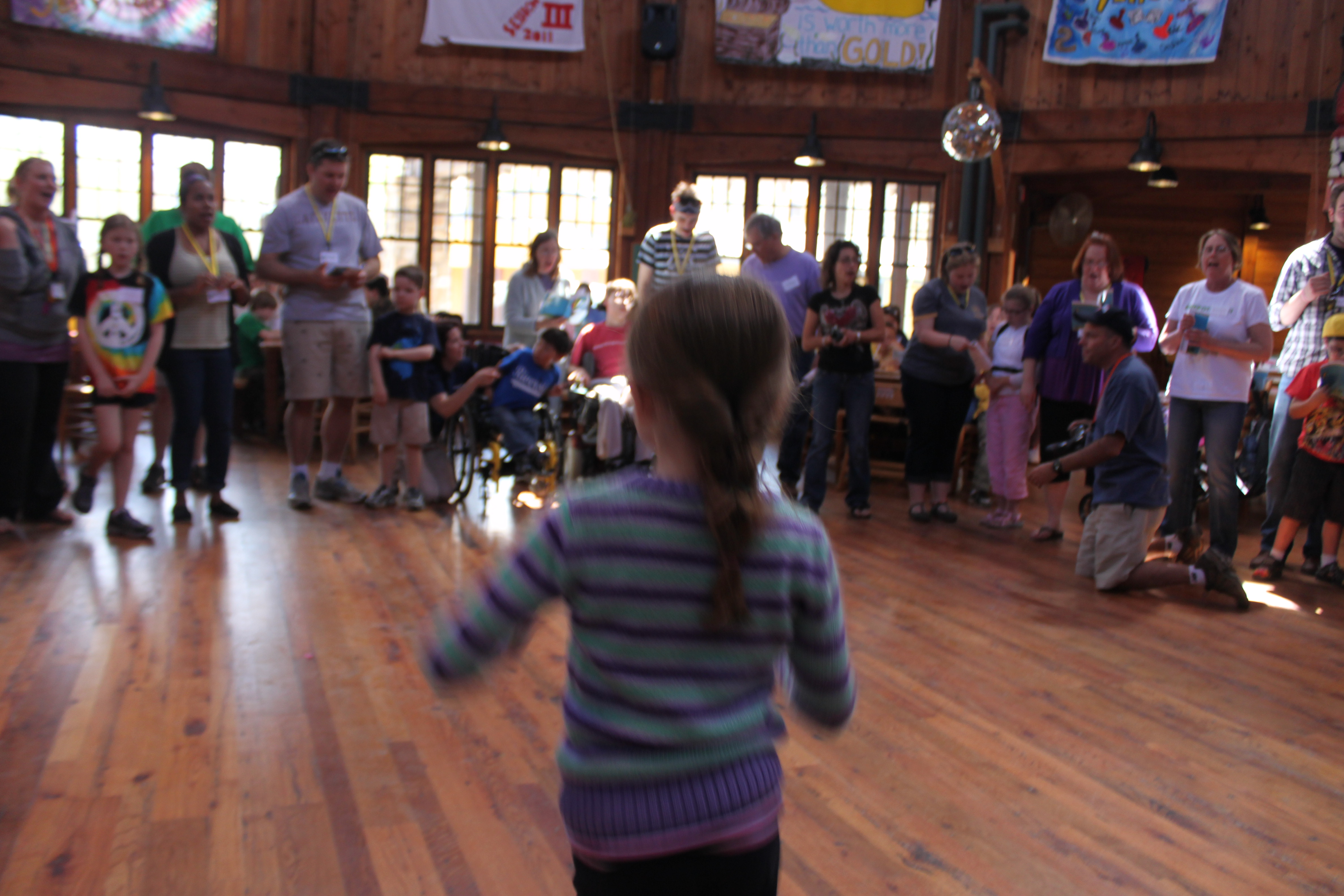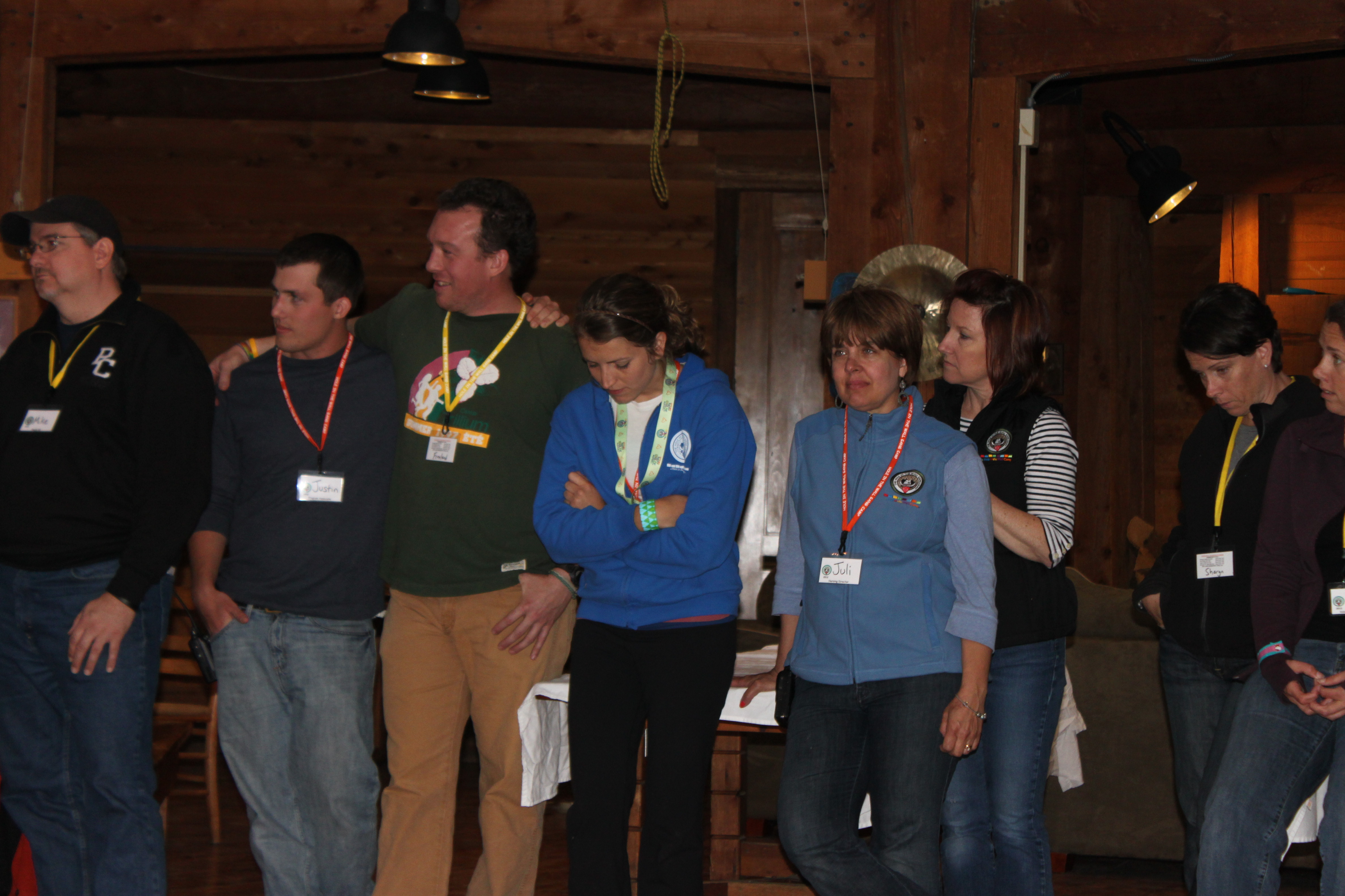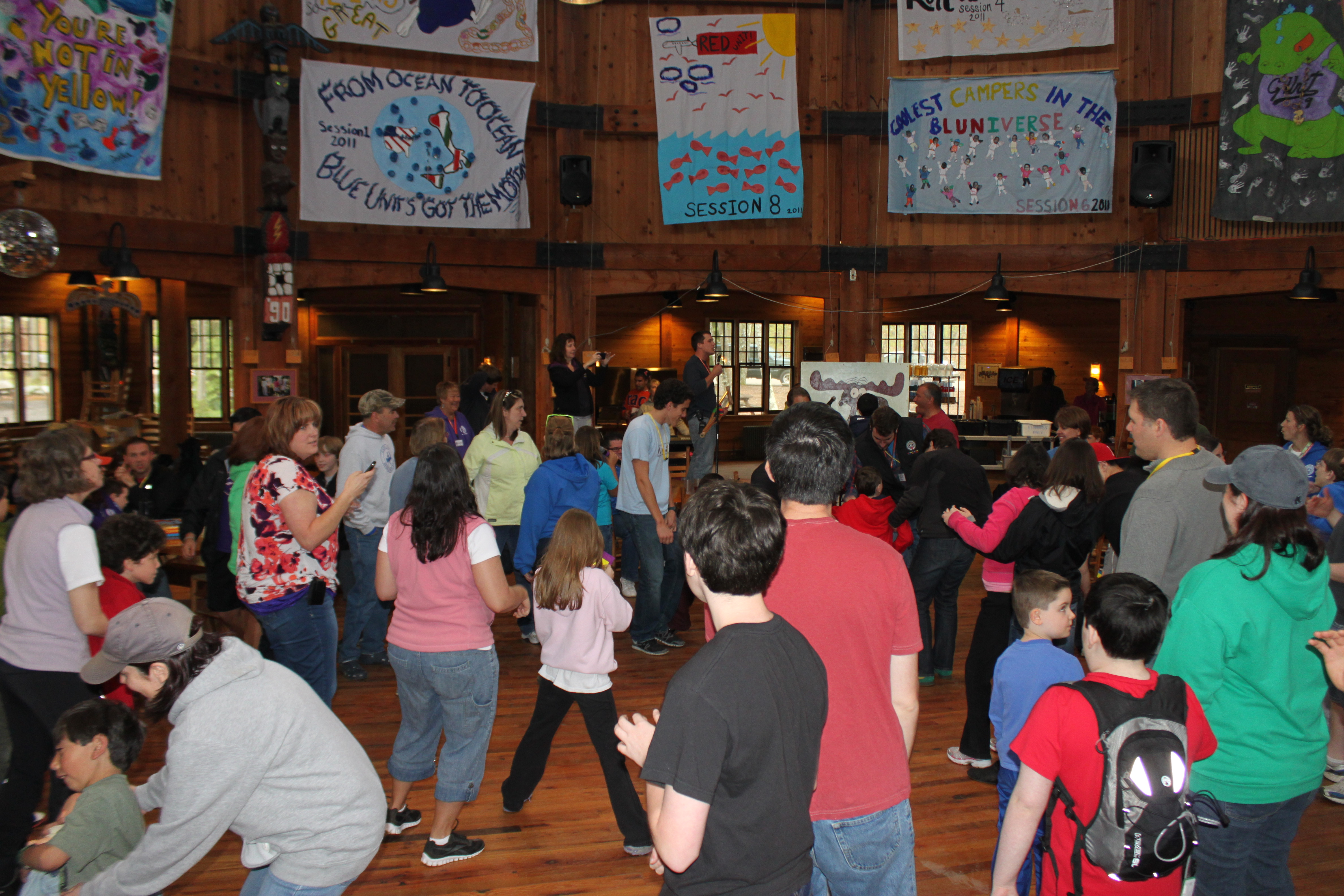 We headed into the dining hall and joined in on the festivities that were already taking place, and I ran into 3 of my friends (Nancy, Andy, and Karen) almost immediately! We then were introduced to the Camp, the schedule for the evening, and we learned a few “Camp” past times….like – shaking your “Bushy Tail” if you go in the wrong door for the dining hall (there’s one side for ‘in’ and one side for ‘out’ – and if you get caught going in the wrong way, you have to sing along with a song and do a dance (Shake your Bushy Tail!) with all the others who have done so). It’s pretty cute and the kids got a kick out of it.