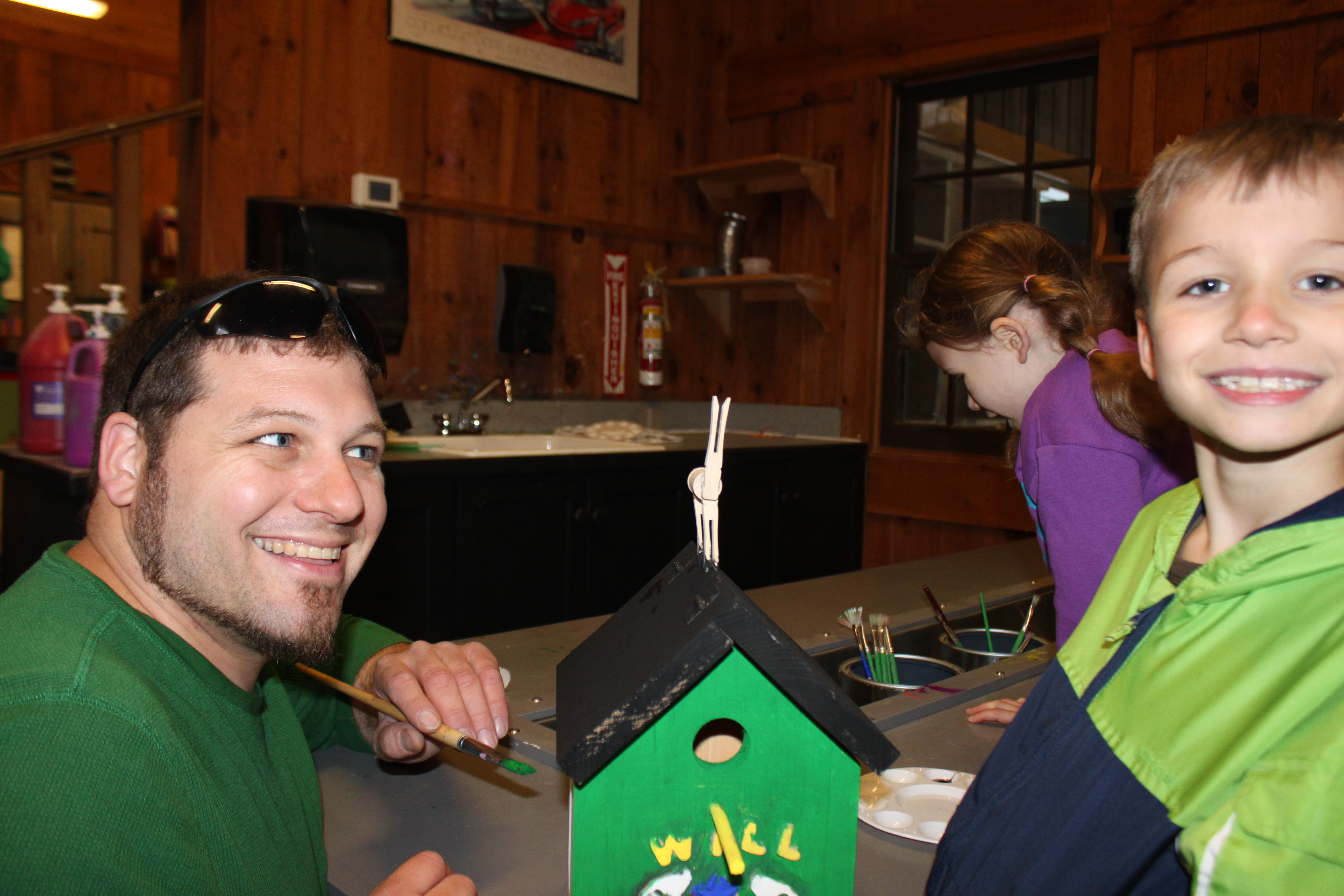 The kids said goodbye to their favorite Boat Dock Warden and we headed up to the Wood Shop/Arts and Crafts cabins so the kids could finish the projects they had started the day before. Thankfully the rain held off until we got inside…then it poured!