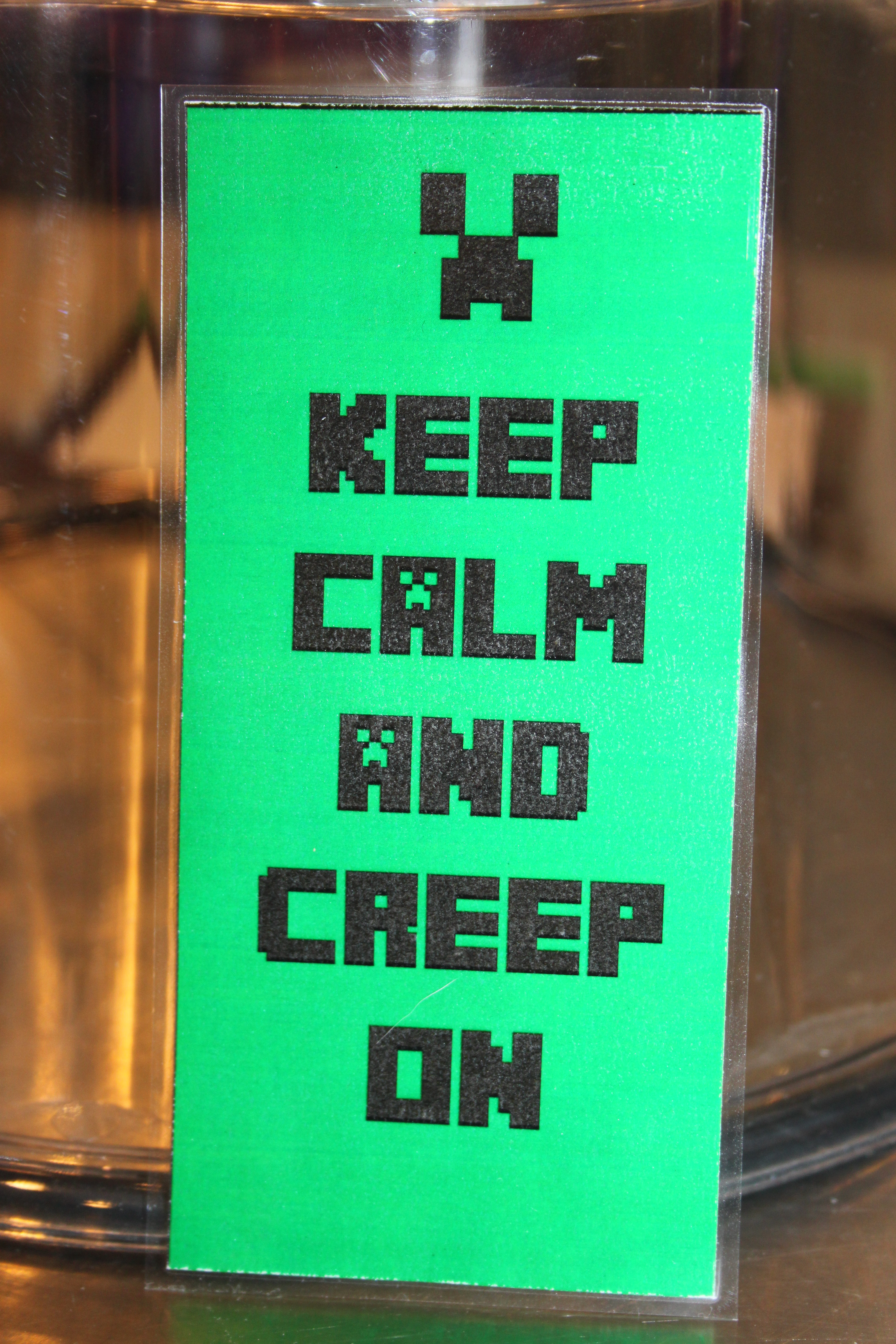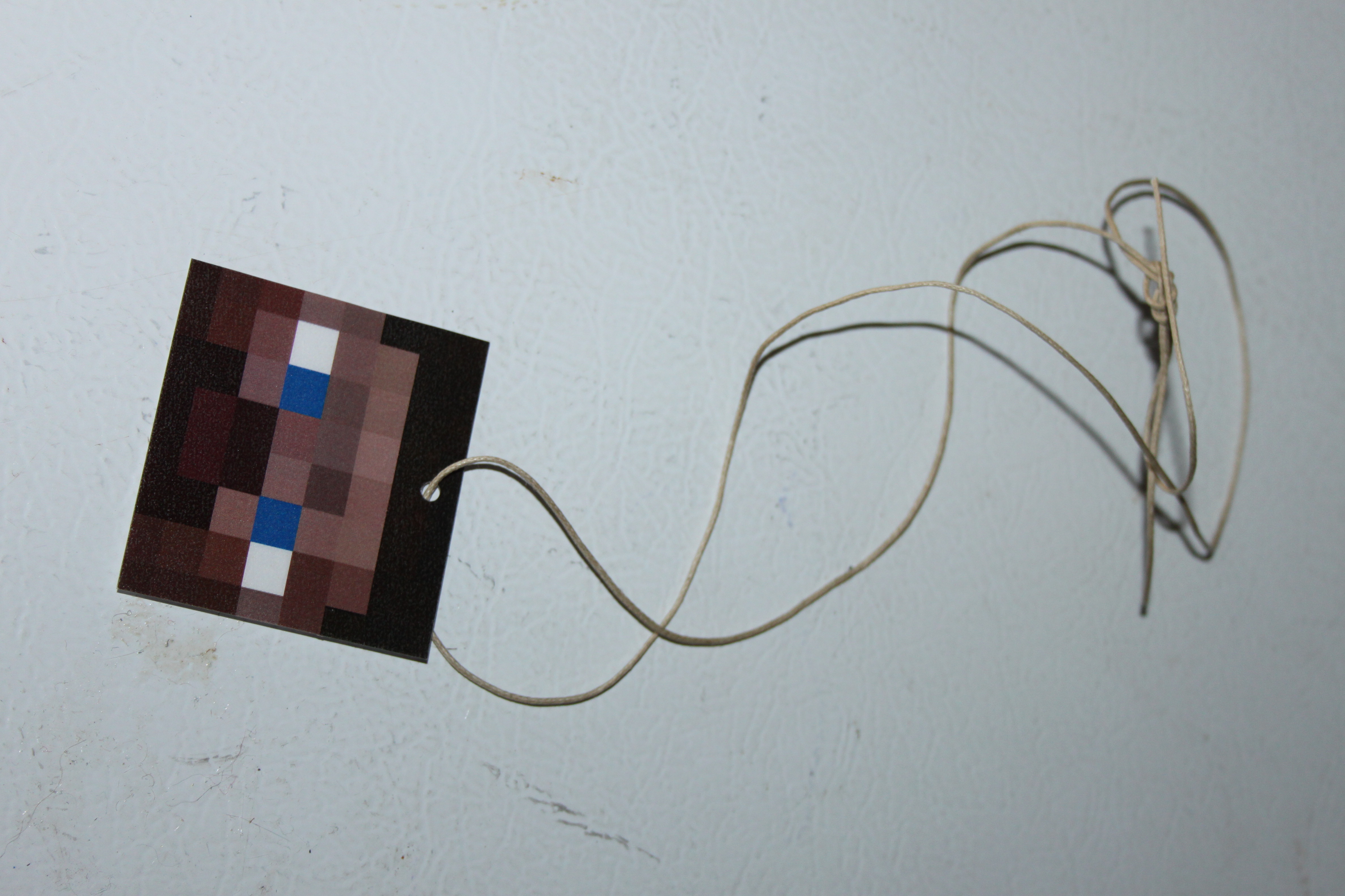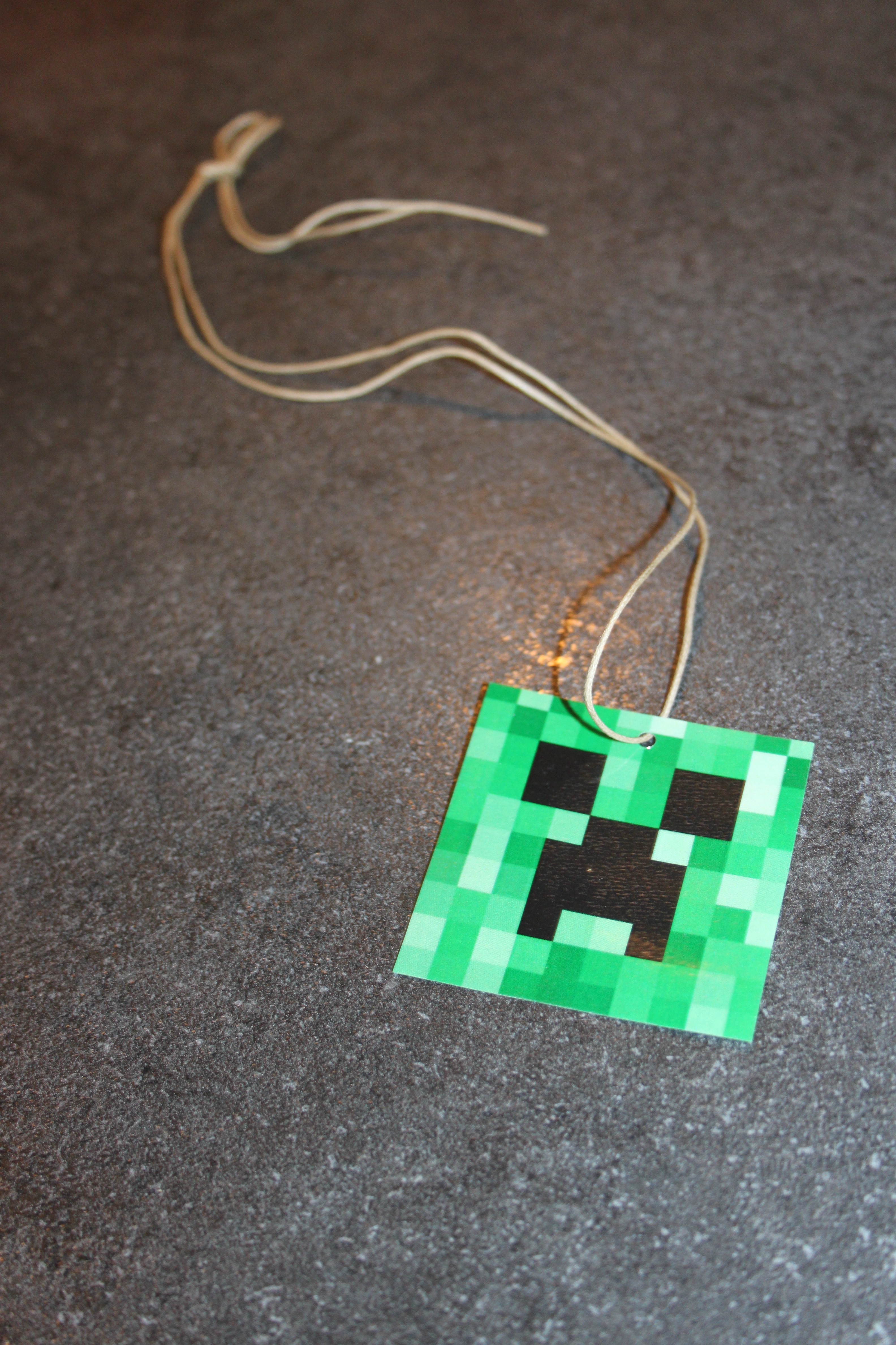 And finally, I printed small Steve and Creeper faces, cut them out and laminated them. I punched a hole in the top of the center of each face and threaded some hemp through the hole to make necklaces for the goody bag as well.