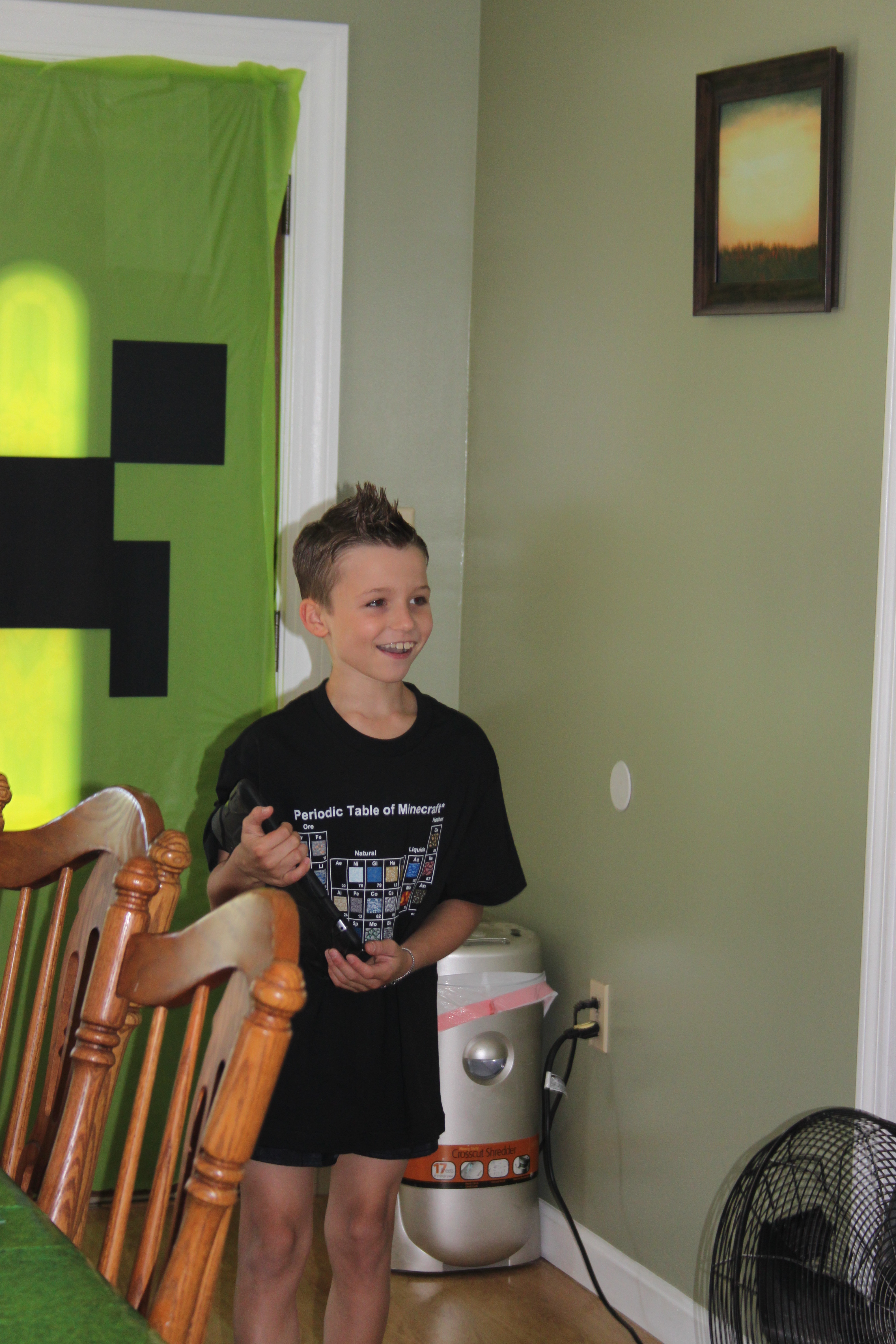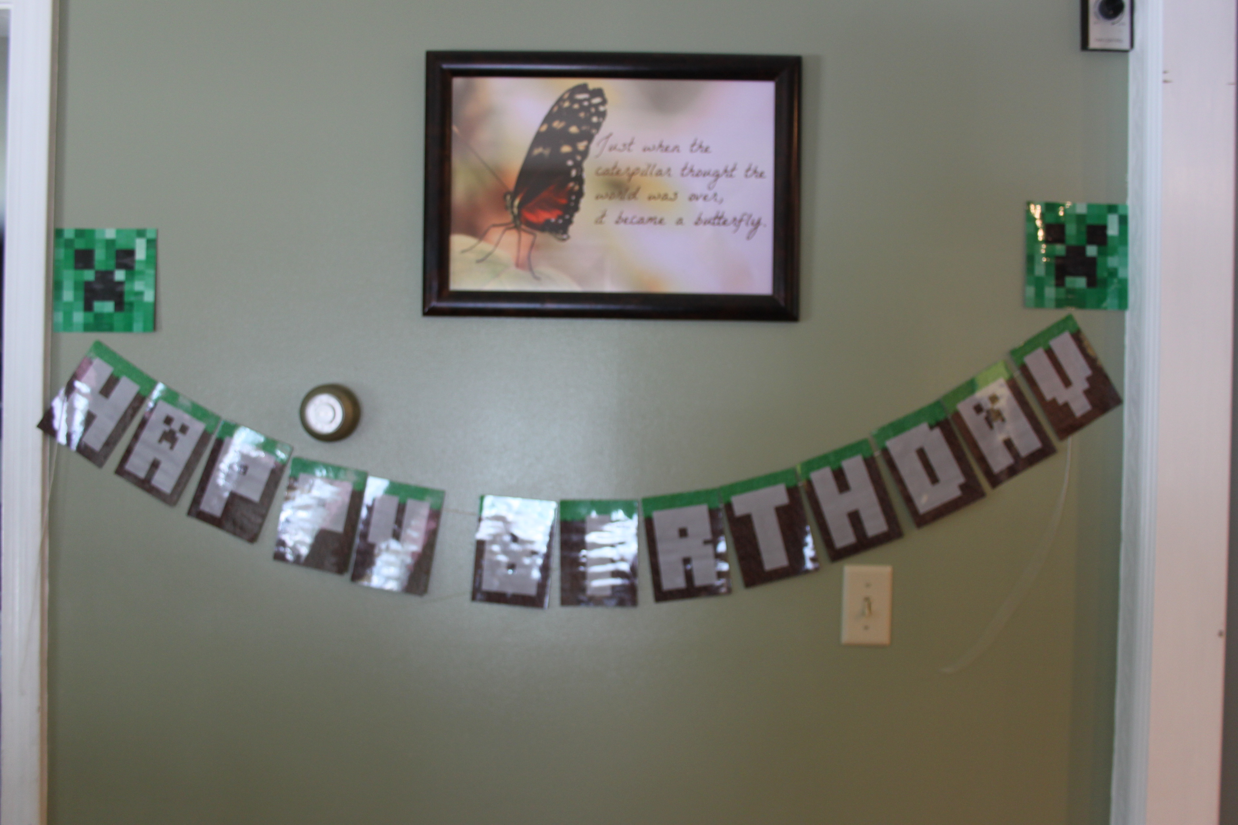 I took small square dark green, light green, and black plates and used some adhesive tacky stuff (I forget the name, but it’s safe for walls) and created a Creeper face on the wall.