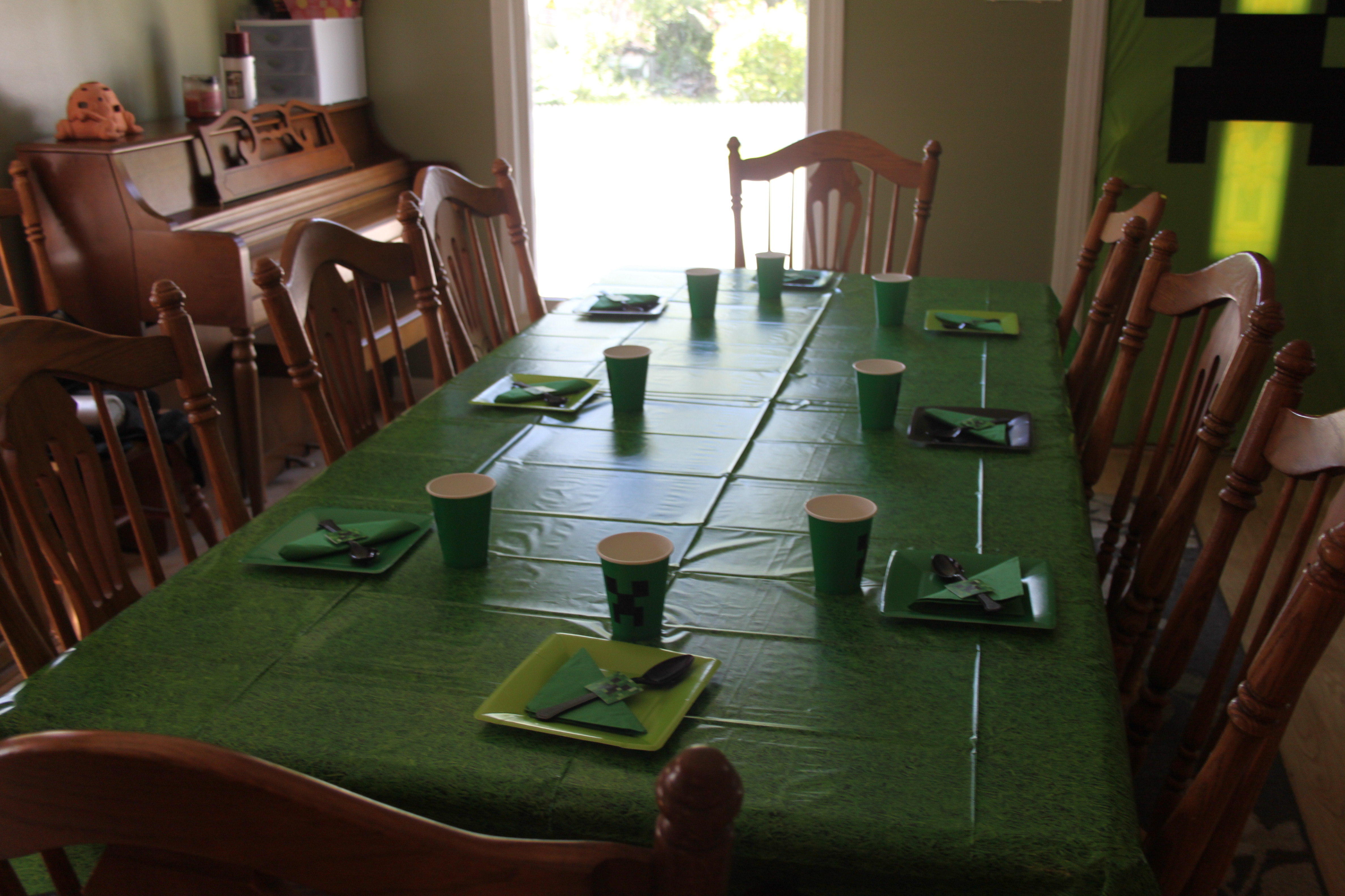Even the spoons had some decor – I took some of the leftover small Creeper faces, cut them out, laminated them and then used a glue dot to adhere it to black spoons. I used light green plates with dark Green napkins