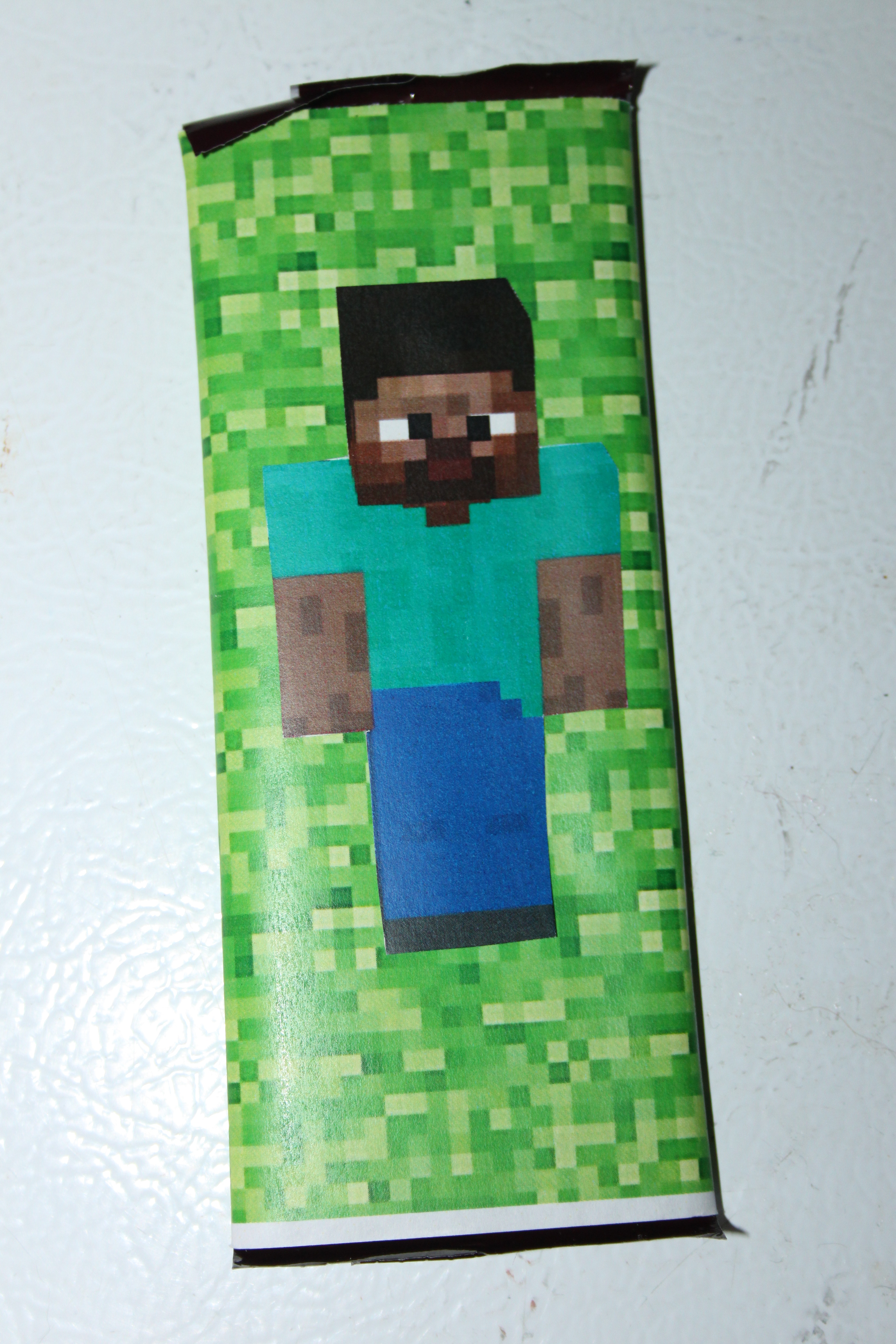 A chocolate bar (I used Hershey’s) with wrapped with a print out of ‘Minecraft’ grass and I printed out a small picture of Steve and cut it out and taped it to the front (this did not need to be placed in a clear bag).